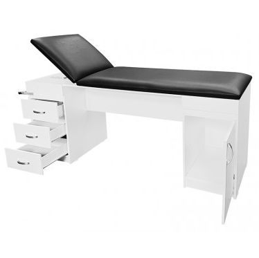 Maca clínica MDF, Construída em MDF com revestimento BP (melamínico de baixa pressão) leito acolchoado em espuma densidade 23 e napa, cabeceira reclinável. Gabinete com 2 módulos 1 com 3 gavetas e outro com 1 armário com 1 prateleira interna.
